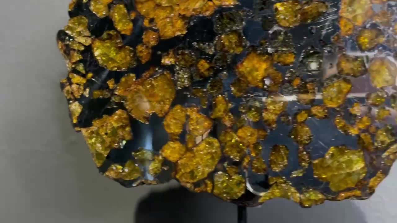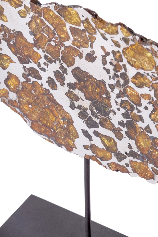 A beautiful specimen of the Imilac meteorite in the form of a polished slice. Imilac is a pallasite. Only a few dozen meteorites of this class have ever been found. On the meteorite slice one can see a characteristic feature of the structure of pallasite: olivine crystals seem to immerse in a metallic “foam”, creating fantastic patterns. Imilac is known among collectors for the high concentration of olivine in specimens. The play of colors on the edges of olivine crystals is clearly visible under accent lighting. Another feature is the smooth surface of the metal sections, devoid of Widmanstetten lines.