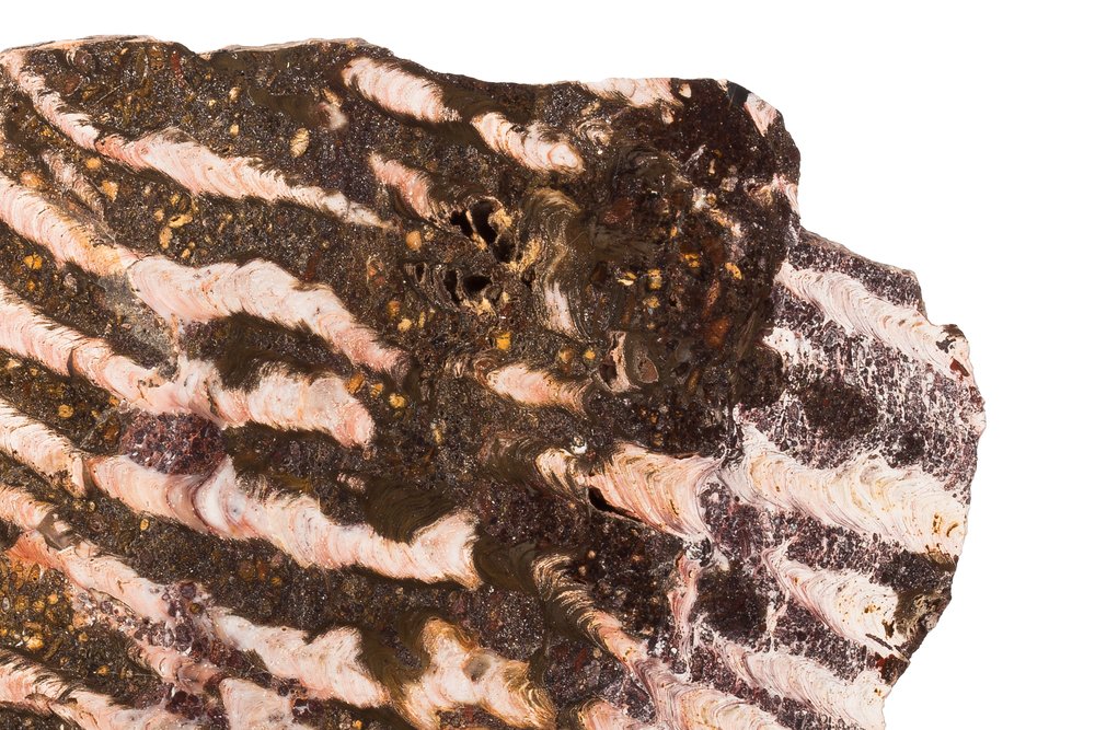 This stone plate is a 2.2 to 2.4 billion year old stromatolite fragment. Stromatolites are not living creatures, but structures created by microbial assemblages, bacterial mats. The carbonate secretions of microorganisms are layered on top of each other forming a mineral "cake". Bacterial mats are the oldest ecosystems in Earth's history; they appeared 3.5 billion years ago and they still exist today. Today, one of the places where you can see the stromatolites created as a result of bacterial mats is Shark Bay in Western Australia.