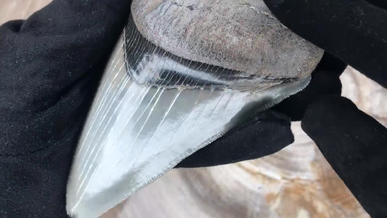 This tooth received the status of a collector's item for a reason. The condition is almost perfect. The surface of the tooth does not bear any damage. The sawtooth edge does not contain significant defects. Unique coloring, which gives the tooth an aesthetic appeal, completes the picture.