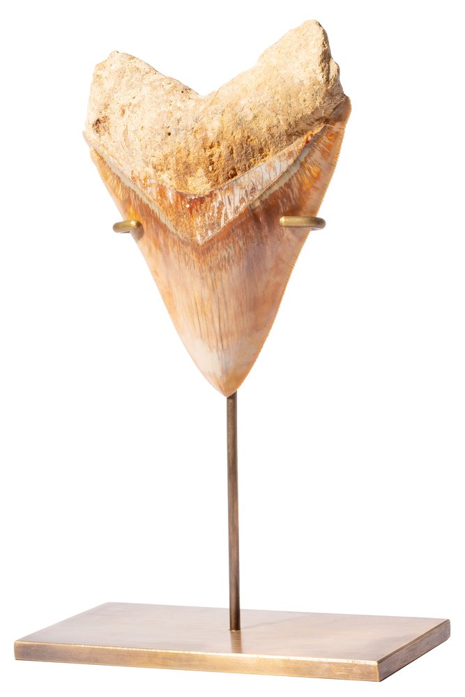 The brass stand harmonizes well with the coloring, making the tooth an elegant decoration of your interior.