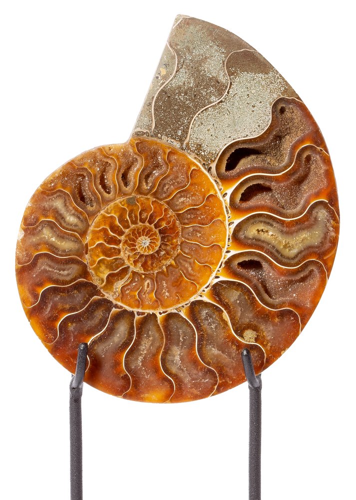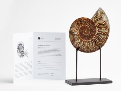 Their shells were replaced by calcite, which comes in the most incredible colors under the impact of other minerals. The base color of the Madagascar ammonites is amber-red, however leaf-like pattern of paddle lines overlays on top of it. The shells, covered with intricate ornaments, become real works of art.
