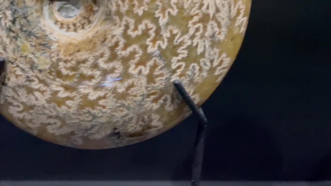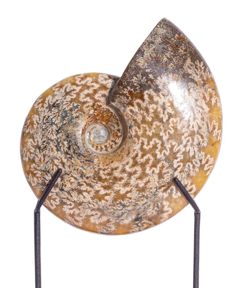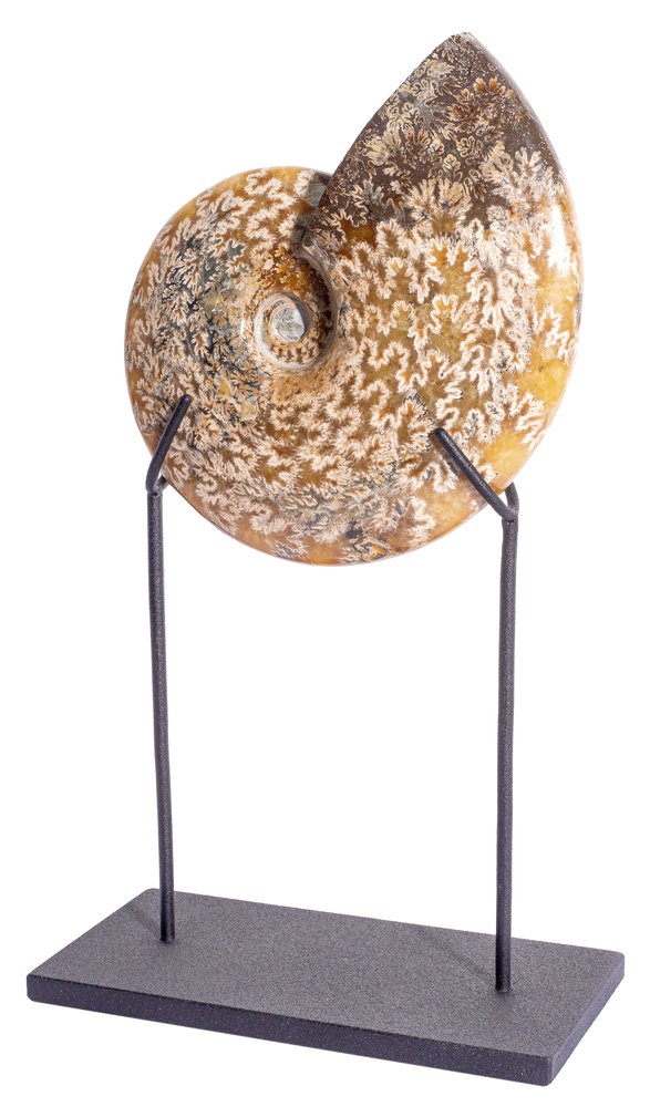 The paddle lines form the pattern on the surface of the shell. In these parts of the surface, internal cavities were connected to the outer walls of the ammonite shell. The shell is mostly replaced by calcite, which has a warm, pleasant color.