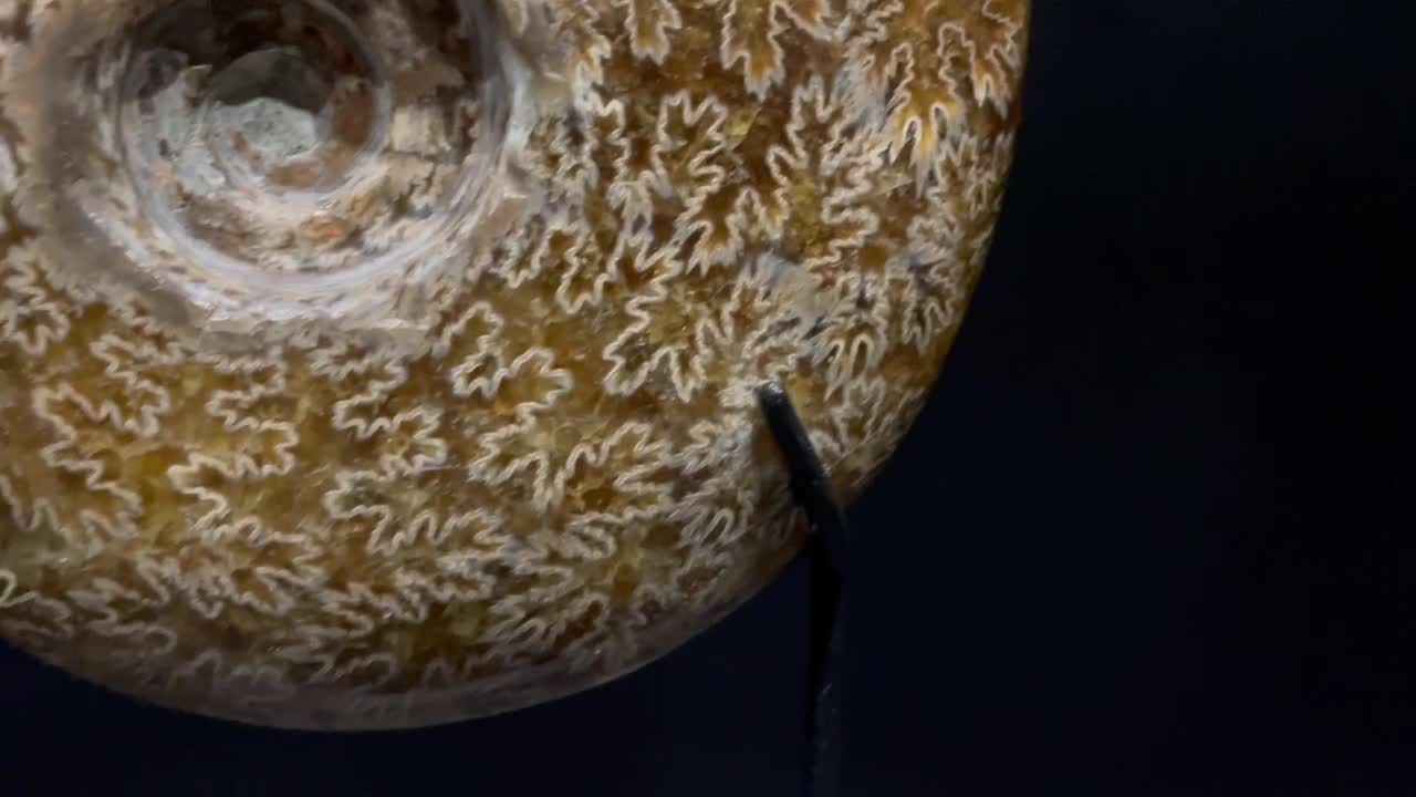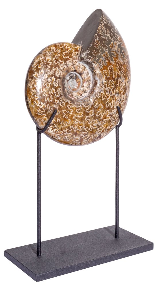 The paddle lines form the pattern on the surface of the shell. In these parts of the surface, internal cavities were connected to the outer walls of the ammonite shell. The shell is mostly replaced by calcite, which has a warm, pleasant color.
