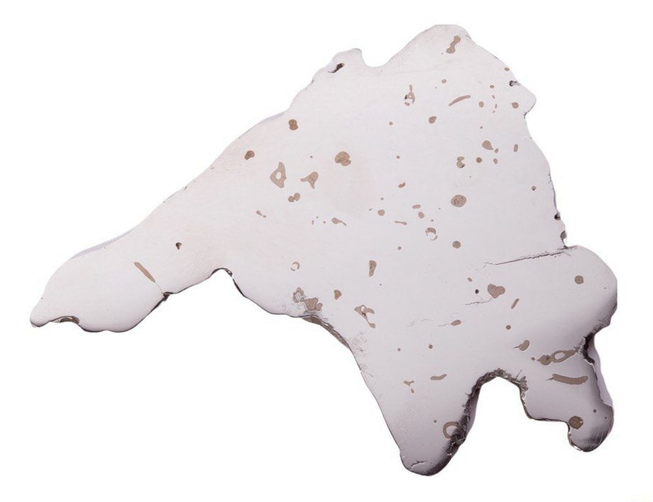 A fragment of the Dronino meteorite was discovered in the Ryazan region in 2000. The area of the cut is polished to a mirror shine creating a sharp contrast with the rest of the fragment surface.