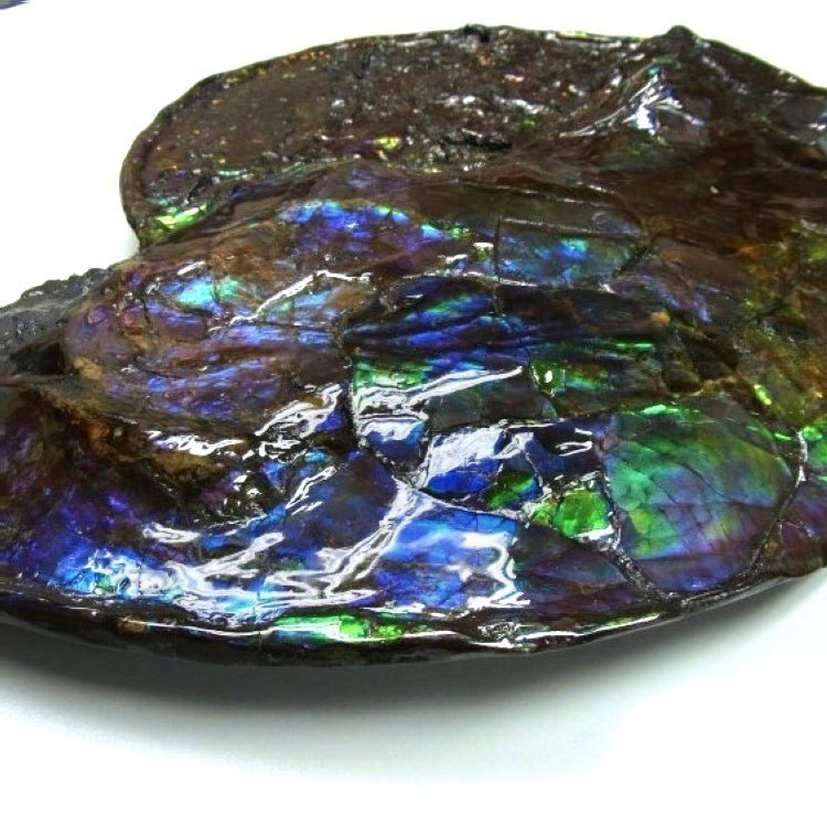 The mother of pearl, which is usually destroyed, was preserved due to the calcium compounds and salts of various metals that soaked it up. This mineral is called ammolite, and the only place in the world where it is found is the province of Alberta in Canada. The blue-green color of this specimen is not very common and suggests copper compounds. The light directed at the ammonite at different angles can create an iridescence effect, allowing some colors to flow into others. Very few gemstones can boast such an effect.