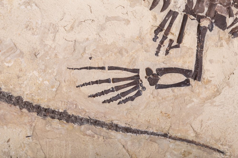 The skeleton is perfectly preserved: vertebrae, skull bones, phalanges and thin teeth are in excellent condition, though it is at least 40 million years older than the first dinosaurs!