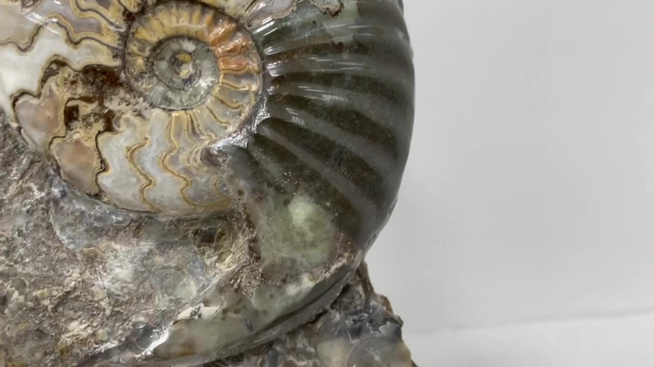 The shell has a preserved nacreous layer with a delicate greenish tint. The lobed line forms a beautiful pattern of transverse strips on the surface. The stone matrix on which the ammonite is placed is a conglomerate of fossilized silt and bivalve shells. The ammonite will look great in a niche or on a shelf, adding sophistication to the interior.
