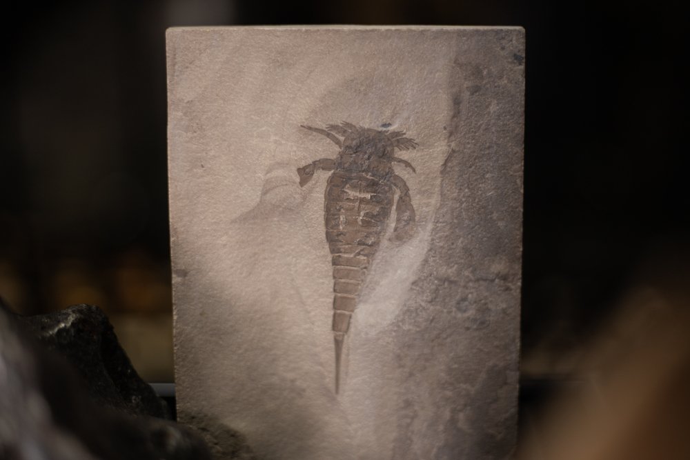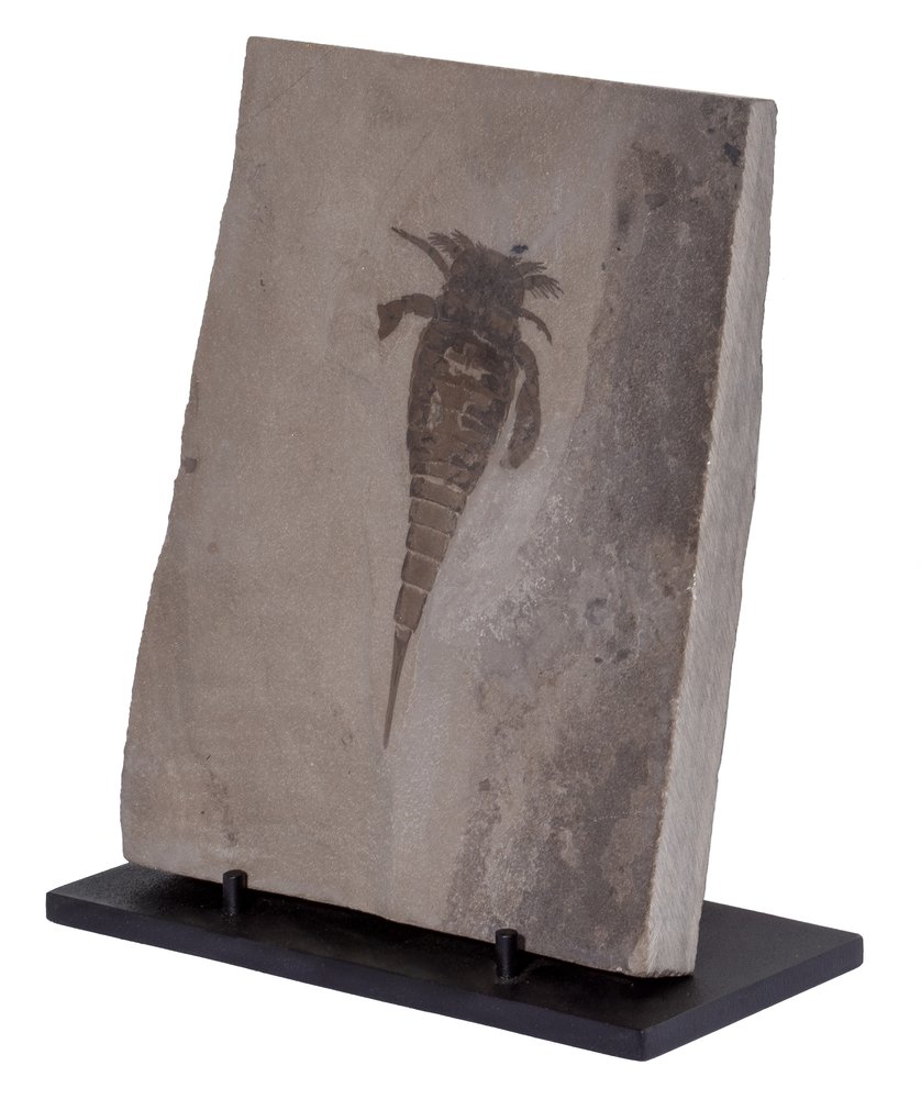 A continuous carapace protects the eurypterus’ thorax; the body and tail consist of 12 segments that become smaller towards a blade-shaped telson. Two preserved appendages out of six are visible on the head. They helped to bring food to the mouth, to move over the sea bottom, and served as touch organs. The flat, shortened claws acted as paddles when swimming, and even the species name "remipes" can be translated as «paddle-footed".