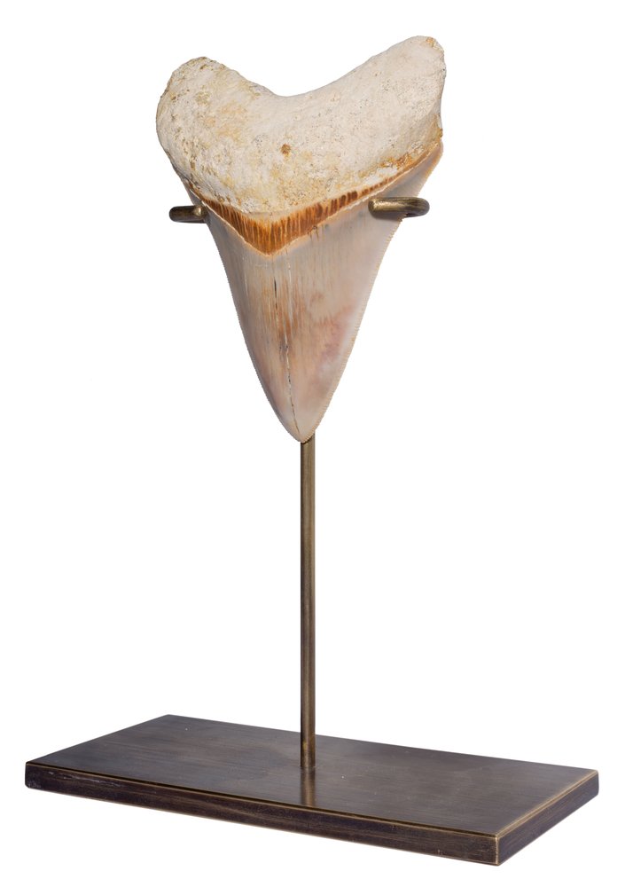 The brass stand harmonizes well with the coloring, making the tooth an elegant decoration of your interior.
