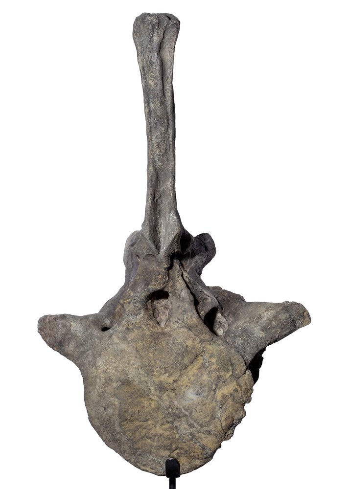 The vertebra is impressive in size no less than its owner is. Its height is 77 cm. To compare, the entire spine of a tall man has this length. This is a tail vertebra, one of the first in the 11-meter tail. It has a complex morphology. The vertebral body is round, flattened; lateral processes are wide, wedge-shaped; the spinous process long, slightly curved backwards. Below the lateral process, there are noticeable depressions for air sacs that run along the entire spine. They reduced the weight of the animal and took part in the process of respiration.