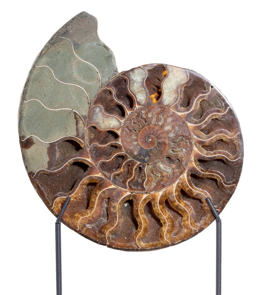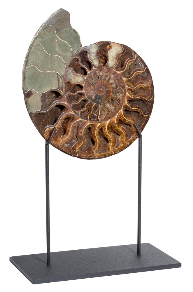 Their shells were replaced by calcite, which comes in the most incredible colors under the impact of other minerals. The base color of the Madagascar ammonites is amber-red, however leaf-like pattern of paddle lines overlays on top of it. The shells, covered with intricate ornaments, become real works of art. Mounted on an elegant stand, they will perfectly fit into your interior.