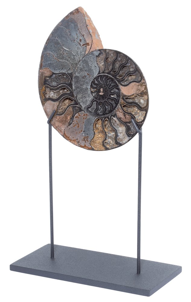 Ammonites of the genus Cleoniceras are one of the most popular collectibles. These fossils are valued for their harmonious shell proportions and variety of coloration. The color spectrum depends on the conditions in which the mineralization took place, that is why one glance is often enough to determine the place of discovery. Madagascar ammonite specimens are of particular value. Among them quite rare black-brown specimens stand out.