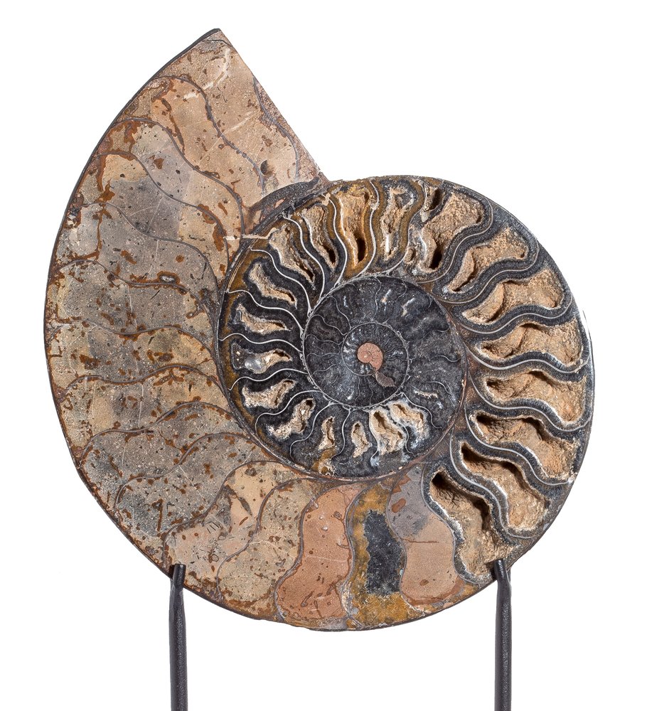 Ammonites of the genus Cleoniceras are one of the most popular collectibles. These fossils are valued for their harmonious shell proportions and variety of coloration. The color spectrum depends on the conditions in which the mineralization took place, that is why one glance is often enough to determine the place of discovery. Madagascar ammonite specimens are of particular value. Among them quite rare black-brown specimens stand out.