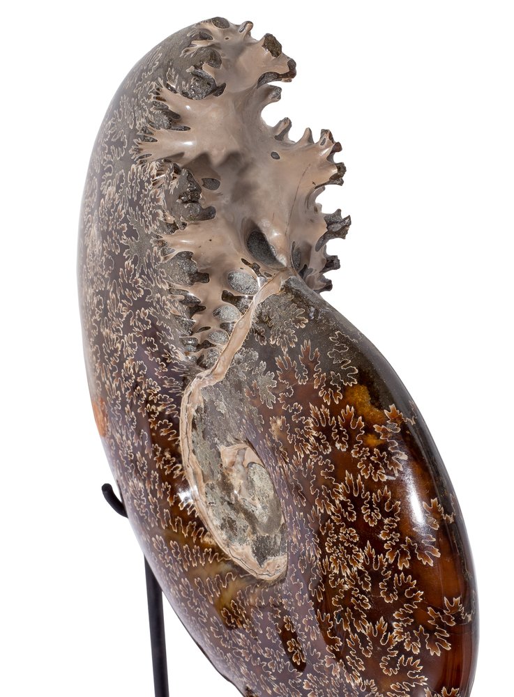 The paddle lines form the pattern on the surface of the shell. In these parts of the surface, internal cavities were connected to the outer walls of the ammonite shell. The shell is mostly replaced by calcite, which has a warm, pleasant color.