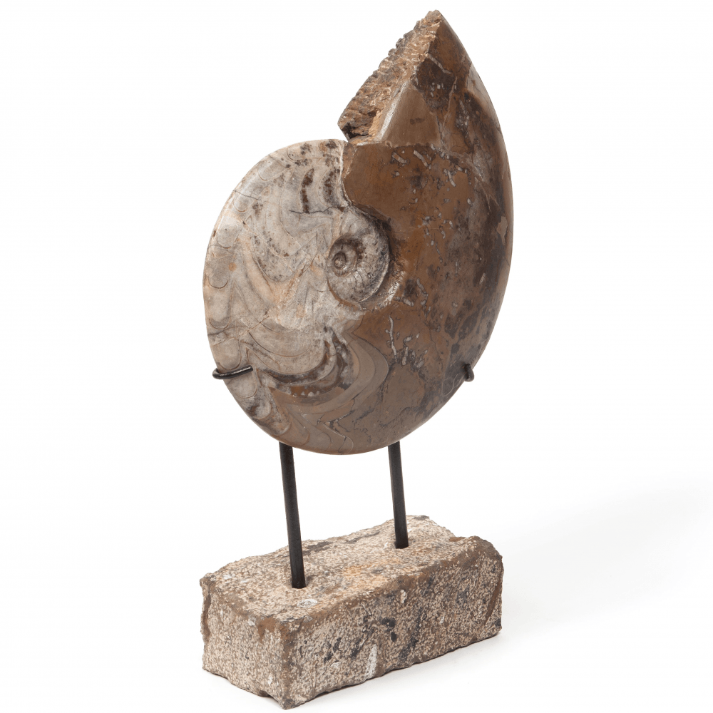 Carinoceras is a genus of Upper Devonian goniatites with a shell considerably flattened on the sides. This shape is characteristic of actively floating mollusks inhabiting the open sea. Goniatites are known as the oldest group of ammonites. Their shells are arranged simpler than those of more advanced congeners, in particular, they have wavy or zigzag lobed line.